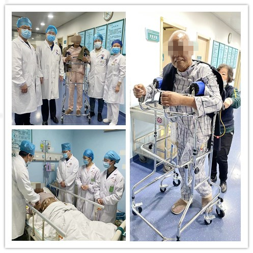 在急诊科、胃肠外科医生多方努力下,患者迅速经绿色通道转诊至重症医学科监护室,经过41天与病魔的生死较量,周嗲嗲脱离呼吸机,带气管切开套管转入胃肠外科继续治疗。在胃肠外科陈超武主任、李光义医生、王励之医生等医护人员的悉心治疗和家属的精心照顾下,周嗲嗲顺利拔出了气管切开套管,从耳不能听、口不能言到现在对答如流,从手不能抬到现在能自己站立行走,周嗲嗲和家属对医护人员充满感激之情。