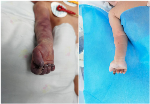 35+4周早产的毛毛(化名),出生时只有2千克,四肢细小,四肢的动脉更是细得难以看见。因为吸吮不足,加上感染在当地住院,经过医护细致照料,本可以很快出院了,不幸可怕的一幕发生了。宝宝突然出现了右手指发白、转而迅速到手背、腕部、同时很快出现淤青,宝宝上肢无力、活动减少最后毫无动弹之力。