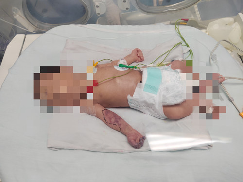 当地医院紧急呼救,并传来宝宝手臂照片。根据经验,我院新生儿科张爱民主任及护士长吴莎莉判断孩子是血栓形成,必须立即救治,否则后果不堪设想。