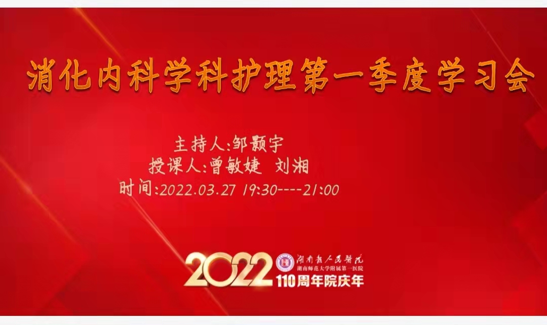 为进一步提升消化内科护理人员专科护理能力和教学水平,2022年3月27日19:30,消化内科学科护理第一季度学习会以线上会议形式召开,会议邀请消化内科二病室护士长曾敏婕,消化内科二病室责任组长刘湘进行线上授课,学习会由消化内科学科护士长邹颢宇主持。