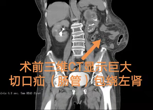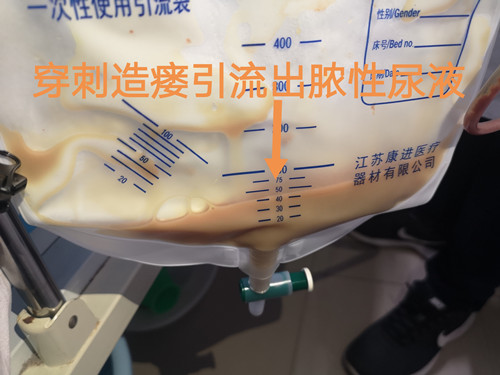 82岁的何奶奶因腰腹痛不适,考虑左肾积脓合并左侧腰腹壁巨大切口疝昨日收住我院泌尿外科四病区,入院体查左侧腰腹部可见一大小约20cm的巨大包块,抽血查C反应蛋白261.33mg/L,中性粒细胞比值91%。术前检查显示左肾积脓并左肾结石、左肾萎缩、2型糖尿病、慢性胰腺炎、左侧腹壁切口疝,完善术前准备后,2022年3月29日在全麻下行左肾造瘘术,术中在B超引导下精准穿刺,左肾造瘘成功后见脓性液体流出,手术顺利。