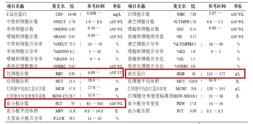 患者严重贫血,血色素为3.6gL,只有正常人的四分之一