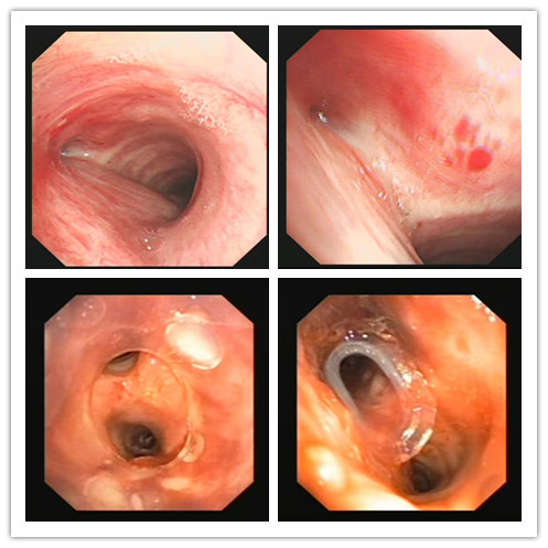 图1图2为支气管镜下支气管结核导致支气管闭塞。图3图4为支架植入后。