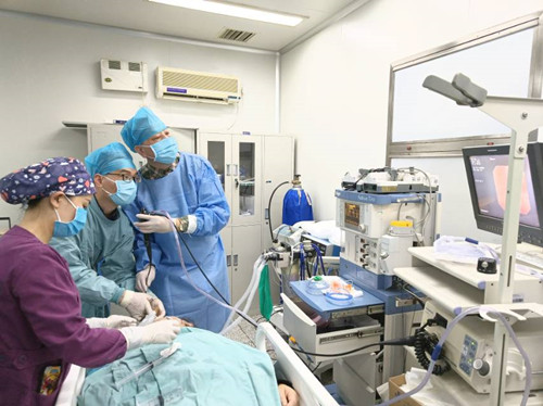 刘志光教授带领的呼吸介入团队经充分讨论后为张奶奶制定了详细介入治疗方案。2月21日,张奶奶接受了首次支气管镜介入治疗,刘志光主任医师、谭建龙副主任医师根据术前CT详细规划治疗路径,在术中以支气管内超声为引导,步步为营,成功为张奶奶打通左主支气管,并引流大量脓性分泌物。