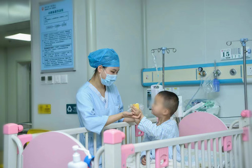 轩轩入院时呼吸急促伴有发绀,病情危重,经医生诊断为呼吸衰竭、重症肺炎,儿童重症监护团队对其进行了无创呼吸机辅助通气等诊疗和救治。治疗过程中由于轩轩无法沟通,听不懂指令,给治疗和护理带来了很大的难度,科室护士阿姨们只有轮班守护在床旁安抚烦躁的他,才能安静地配合无创呼吸机的治疗。半个月后,轩轩病情好转,但由于疫情防控问题,轩轩一直未能回到当地福利院。轩轩生活不能自理,PICU的医护们担任起临时妈妈的角色。科室为轩轩制定了针对性的照护方案,一方面要防止他产生过激的行为,保证他的安全。另一方面,在照顾好他之外还要兼顾其他的护理和治疗工作。