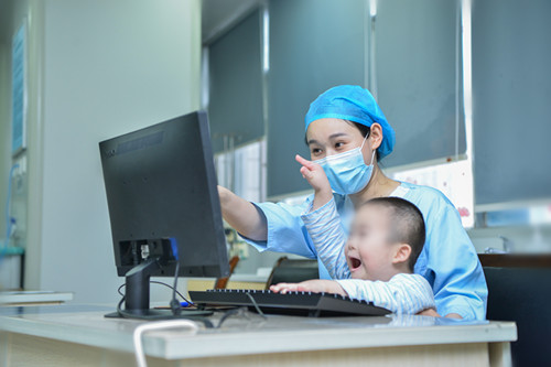在繁忙的工作之余,“妈妈们”会陪他看动画片,听儿歌,陪他玩耍。每个医护只要有空,都喜欢去他的床头陪他玩一会。轩轩喜欢陪着医护妈妈们坐在电脑前,他时不时也会有模有样地敲打着键盘。怕他在医院无聊,很多医护妈妈们还自费给他购买健康安全的玩具。大家还特别喜欢给他投食,每天轩轩的柜子里有各种美食。科室护士吴萍萍看到轩轩没有带鞋子而没办法下床行走,便从家里带来了一双自家宝宝的新鞋子过来给他,见他头发长了,给他剪头发,修剪指甲等。轩轩的行走不太灵活,但每天医护妈妈们都要定期牵着他锻炼,每次陪他走完,大家甚至会满头大汗。轩轩智力发育不良,也有很多的不良习惯,比如大便时不会发出信号,一不留神就会弄得满床都是,比如生气了会冲大家吐口水,医护妈妈们每次都要耐心地引导他,并帮他清理、洗澡。