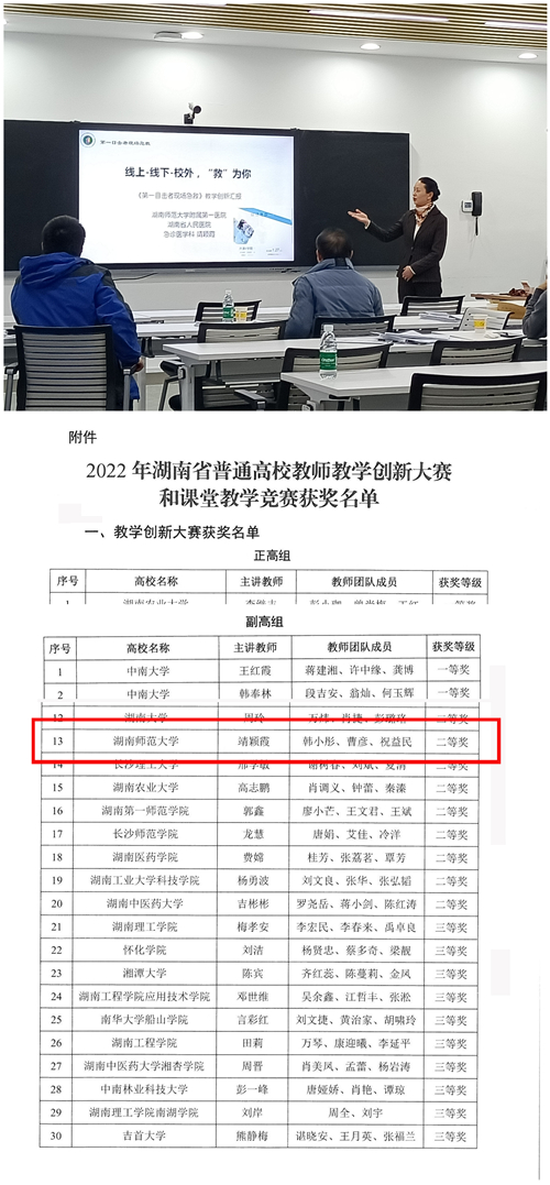 近日,为落实立德树人根本任务,推动课程思政建设和“四新”建设,加快信息技术与教育教学融合创新发展,提升教师教育教学水平,湖南省教育厅、湖南省教育工会联合主办了2022年湖南省普通高校教师教学创新大赛。本次大赛共有全省51所普通高校(含独立学院)推荐的144名教师(团队)同台比拼,我院急诊科靖颖霞教学团队突出重围,荣获省级教学创新大赛二等奖。《第一目击者现场急救》公共选修课程也被立项为湖南师范大学校级规划教材。