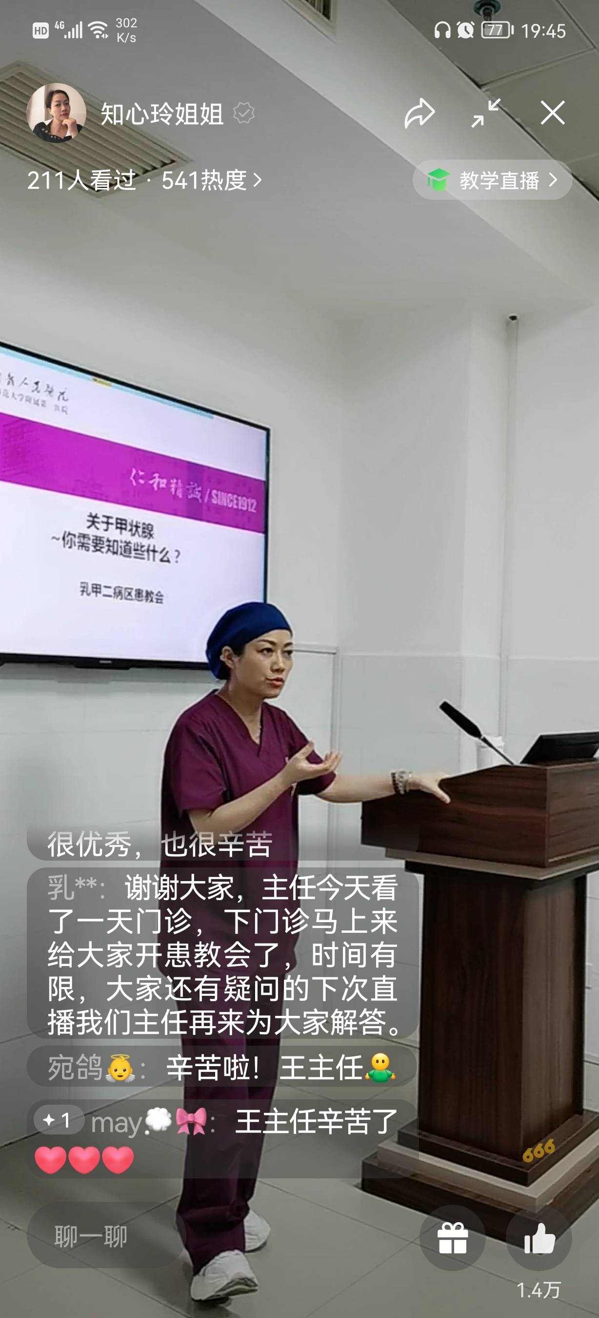 针对线上线下病友们提出的问题,王慧玲主任用通俗易懂的语言耐心地答疑释惑。同时,她以甲状腺切除术后患者的身份,用自己的亲身经历、现身说法,分享术前的心路历程,传授术后的康复经验,极大缓解了病友们焦虑的情绪,增强了战胜疾病的信心。持续了近两个小时,患教会圆满结束,收获了广大患友的大力肯定和点赞。