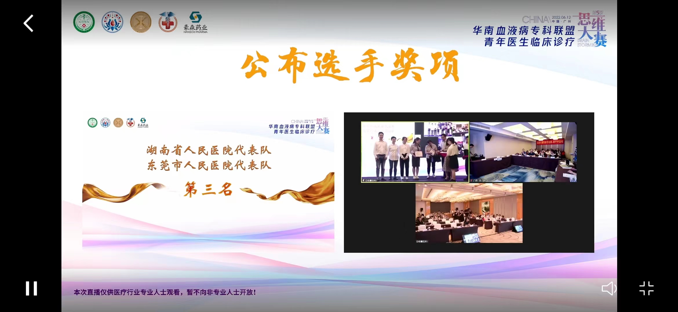 随后,2022年青年医生临床诊疗思维大赛华南晋级赛也在广州圆满落幕。由高清医师、邹彬镔主治医师及陈建军副主任医师组成的湖南省人民医院血液内科代表队一路过关斩将,获得湖南赛区一等奖后闯入华南赛区决赛,与来自广东、江西、广西等10支强兵劲旅奋战角逐。在比赛中,各位选手诊疗思路清晰,病例分析中抽丝剥茧,对答妙语连珠,展示了深厚的专业功底,最终荣获华南赛区决赛三等奖。