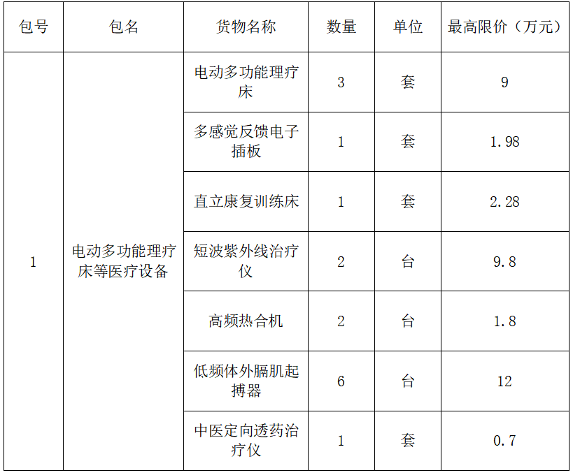 医院根据工作需要,拟在“51医疗采购平台”上采用院内公开招标方式对电动多功能理疗床等医疗设备进行招标采购,现公开邀请符合投标资格要求的供应商前来参加。(本项目拒绝进口产品)