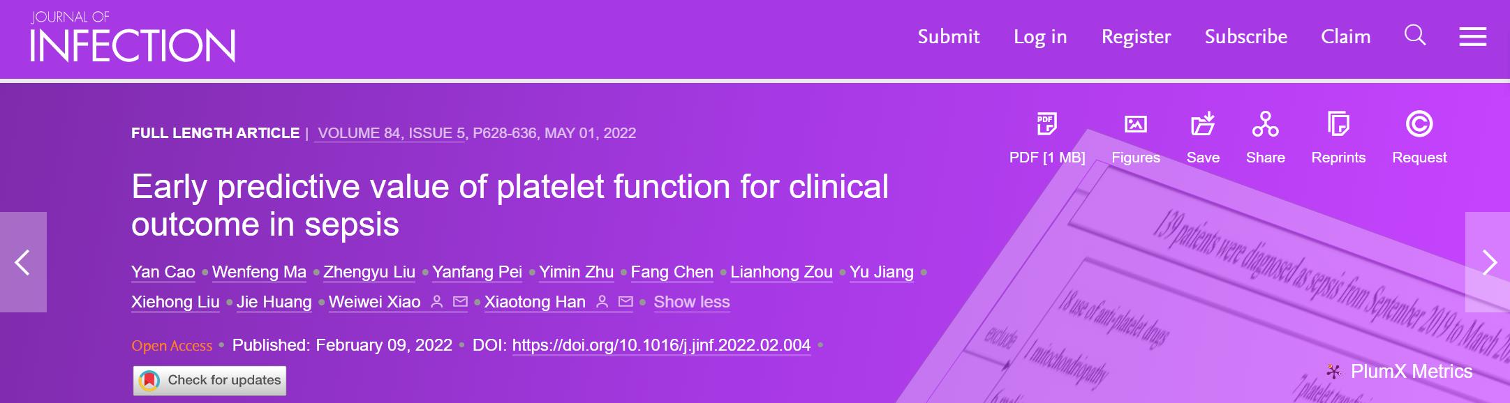 湖南省人民医院急诊医学科韩小彤主任团队,在脓毒症领域近期取得的重要研究成果“Early predictive value of platelet function for clinical outcome in sepsis”,以原创论著形式在国际著名医学期刊、感染病领域顶级期刊《Journal of infection》(Q1, IF 38.637)发表。湖南省人民医院急诊医学科主任韩小彤为通讯作者,急诊二部病区主任曹彦为论文单独第一作者,国际医学部副主任、急诊医学副主任医师肖薇薇为共同通讯作者。
