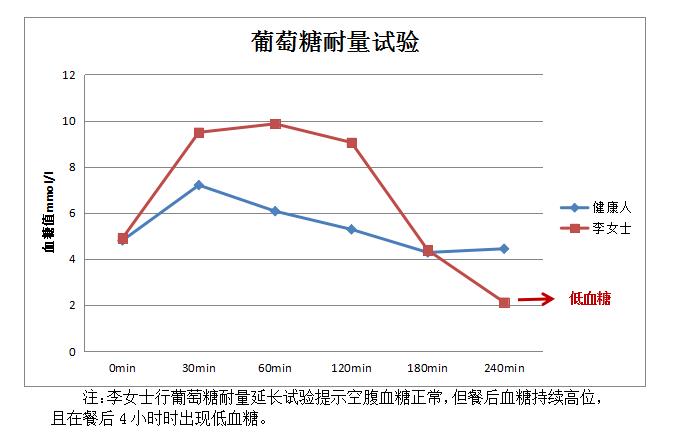 家住马王堆的李女士因反复出现中餐前心悸、手抖,于1周前到湖南省人民医院马王堆院区内分泌二病区就诊。在经相关内分泌试验检查后发现,李女士餐后4小时血糖只有2.12mmol/L(正常为3.89mmol/L-6.11mmol/L),空腹血糖为4.9mmo/L,餐后2小时血糖为9.05mmol/L,而餐后2小时胰岛素高达1234pmol/L,比正常高10倍,并没有象正常人一样及时的回落,从而导致了她餐后2小时血糖升高,及中餐前的低血糖。因此,李女士被诊断为反应性低血糖。