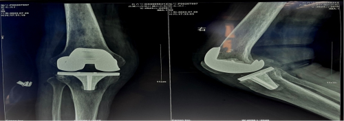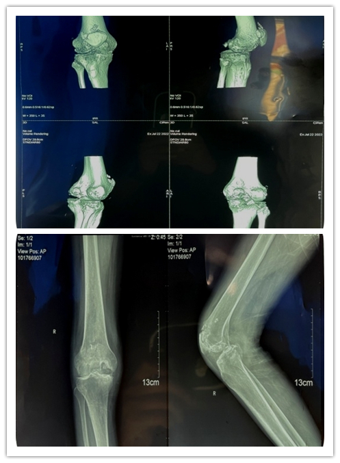 入院后检查后发现,患者营养不良并伴有低蛋白血症,右膝畸形严重,右侧膝关节内翻(内翻15度),是我们常说的“O形腿”,右侧膝关节周围压痛明显,膝关节活动范围10-90°。术前X光片提示右侧膝关节内翻畸形,股骨远端重度缺损。经多学科讨论及评估,医疗团队为患者行右侧人工全膝关节置换手术,从而缓解膝关节疼痛,改善膝关节功能,提高生活质量。