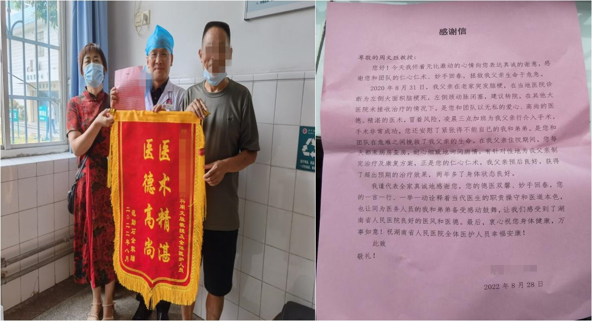 两年后的今天,范叔叔一家怀着赤诚的心感恩周文胜主任团队的仁心仁术,表示周主任团队的“一言一行、一举一动诠释着当代医生的职责操守和医道本色”,让他们感受到了湖南省人民医院良好的医风和医德。