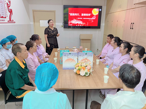 骨科五病区是马王堆院区整体陪护团队进驻的试点科室,到如今已整整五个年头,骨科五病区也已成为整体陪护团队进驻的示范科室。经过五年的培训与磨合,这支吃苦耐劳、专科护理过硬的陪护队伍不仅能及时的为患者及家属提供优质陪护服务,深受患者及家属好评,同时也早已成为科室不可或缺的一份子,是病区医务人员心中可信赖的“好大哥”、“好大姐”。值此中秋佳节之际,陪护大哥、大姐们因为疫情也因为手头陪护的患者,选择坚守岗位,无一人回家探望团圆。得知这一情况后,骨科五病区护士长王桂香悄悄地布置了休息室,为陪护大哥、大姐们精心准备了月饼等小礼品,和他(她)们拉起了家常,热情的介绍长沙本地中秋节的习俗并详细的了解陪护大哥、大姐们的为难之处,力所能及地为他们排忧解难。