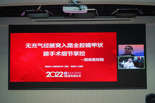 近些年乳腺及甲状腺疾病的发病率均显著上升,严重威胁着人民的健康,而早发现早诊治,大多可以治愈,尤其是随着人们生活水平的提高,患者在寻求医疗救助时,对于微创和美容的要求也越来越高。为推广最新技术,2022年9月 24日由湖南省人民医院(湖南师范大学附属第一医院)、湖南省老年医学研究所、湖南省健康管理学会、中国初级卫生保健基金会乳腺肿瘤专业委员会、中国抗癌协会康复分会主办,湖南省人民医院乳甲外科、湖南省健康管理学会乳腺甲状腺健康管理专委会承办的首届中南地区“经腋求精、见微知著”无充气全腔镜乳甲手术高峰论坛暨首届无充气腔镜乳腺甲状腺技术培训班采取线上为主联合线下的模式在湖南省人民医院马王堆院区多功能厅成功举办。