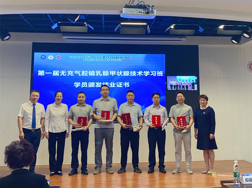 会上,张超杰教授主持了首届中南地区无充气腋窝入路全腔镜甲状腺手术培训班结业典礼,李艳红副院长、范培芝主任向参加首届培训班的省内外学员颁发了结业证书及纪念品,他们均表示,随着国民对甲状(旁)腺、乳腺手术美学要求的日益增长,希望颈胸部不留手术疤痕,不同的手术方式,不同的手术入路,百花齐放、百家争鸣。这次乳甲外二科举办的培训班,推广无充气全腔镜经腋窝入路的乳甲手术技术,加强了专科领域的学术交流,提升了湖南省人民医院乳甲外科的学术地位。