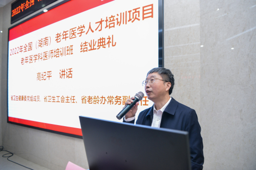高纪平主任在讲话中指出,2021年底,湖南省60岁及以上人口为1310.0万人,占全省常住人口的19.78%,是全国老龄化程度最高、养老负担最重的省份之一。党的二十大报告中提到“推进健康中国建设,把保障人民健康放在优先发展的战略位置,实施积极应对人口老龄化国家战略”,充分体现了总书记、党中央对老年人的关切和对老龄工作的高度重视,为做好新时代老龄工作指明了方向。人口老龄化日益严重,也对综合的、连续的、适宜的老年医疗卫生服务提出了更高要求,希望医院不断提高培训系统化、规范化、标准化、同质化的水平与质量,为加强全省老年医学人才队伍建设,满足老年健康和医养结合服务工作的人才需求贡献更大力量。他希望学员们,一要以培训班搭建的平台为契机,积极主动学习交流,不断提高自身技术水平。二要成为当地老年医学的骨干,为促进各地各单位老年医学高水平发展,为辖区老年人提供优质高效的医疗保健服务。