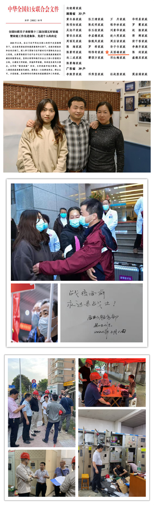 为全面贯彻落实习近平总书记关于注重家庭家教家风建设的重要论述, 经各级妇联组织积极申报,在评选表彰第十三届全国五好家庭暨家庭工作先进集体、先进个人的活动中,全国妇联表彰997户全国“五好家庭”,其中我院职工吴国雄家庭被授予“全国五好家庭”光荣称号。