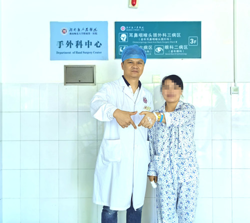 “邓医生,我要用您一起比个心,要不是你们,我右手这根食指不会这么完整。”10月31日,岳阳41岁的闾女士出院前激动地跟邓淑华医生说。前段时间,闾女士上班时发生意外,右手食指被卷入机器内,造成食指指尖约5mm完全离断,损毁严重。到当地医院就诊,医生考虑断指为严重的机械挤压伤,离断层面远,伤后离断指体没有得到很好的保存,存活机率几乎为零,不建议行断指再植术。闾女士随后又辗转了多家大型三甲医院,均得到了同样的回复。