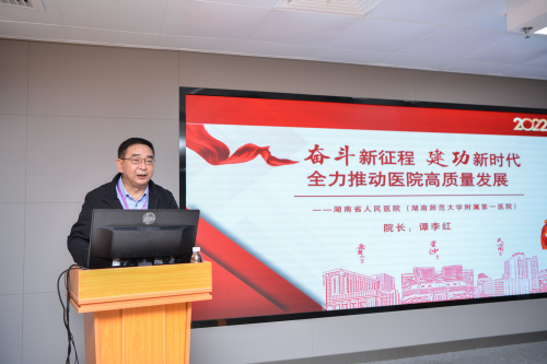 李江南指出,人民医院无愧“人民”二字,始终将人民健康作为福祉,在医疗救治、疫情防控、公共应急等方面勇担公立医院公益性职责,践行了为民初心,在全省起到了很好的示范作用,将口碑写到了三湘大地,写到了老百姓心里。从班子团队看到了向上风貌、奋进精神,很是欣慰。近年来,医疗卫生政策改革也得到广大医师群体的支持和配合,在疫情防控、慢病预防、健康教育、精准医疗等方面担当不可或缺的角色。他强调,医院发展要牢牢树立“四个不能”:一是方向不能偏。要与学习二十大精神相契合,牢固树立以人民为中心的发展理念,坚持人民至上,生命至上。二是管理不能松。要以问题为导向,切实解决老百姓的急难愁盼。加强警示教育,将医疗查房、绩效管理、SPD药品、耗材管理等贯彻始终。三是仁爱不能少。要牢记医者初心,守住从医良心,对待患者要有仁爱之心,赓续红色血脉,传承省医精神。四是红线不能碰。要以名医、名师为榜样,依法执业,全程监督,廉洁从医,用奋斗与智慧续写百年省医辉煌。