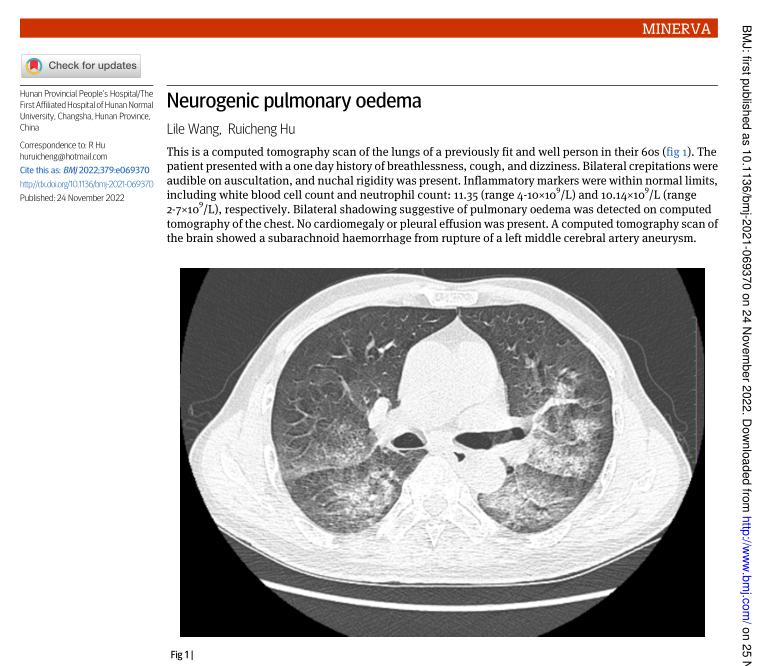 11月24日,我院呼吸内科五病区一例神经源性肺水肿的病例报告发表在世界著名的四大综合性医学期刊之一的《英国医学杂志》(BMJ)上。我院呼吸科王李乐主治医师为该文第一作者,胡瑞成主任医师为通讯作者。BMJ今年影响因子93.3,创造了我院当年即时影响因子的新记录。