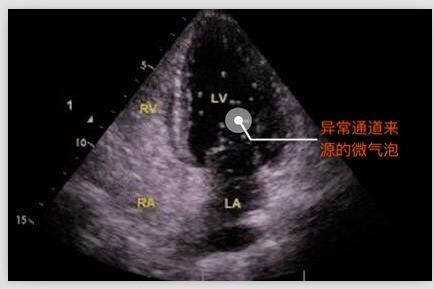 由于微气泡直径平均约15微米,正常情形下微气泡从静脉血管输入后只出现在右心,如果在患者的左心房或者左心室看到有微气泡,则提示可能是从异常的通路由右心腔到达左心腔,即常说的右向左分流。同时,检查中还可以根据微气泡在左心腔室出现的时间早晚初步判断异常是出现在心房心室间隔的缺损,还是出现在心外结构的异常,例如肺动静脉瘘等。