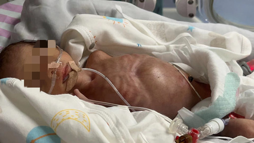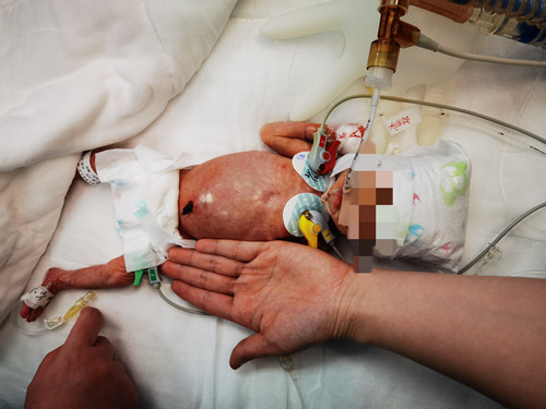 术后新生儿科医护团队给患儿进行呼吸机通气支持、抗感染治疗、肠外营养支持、内环境平衡、防疼痛、保暖等治疗及护理,目前宝宝生命体征平稳。