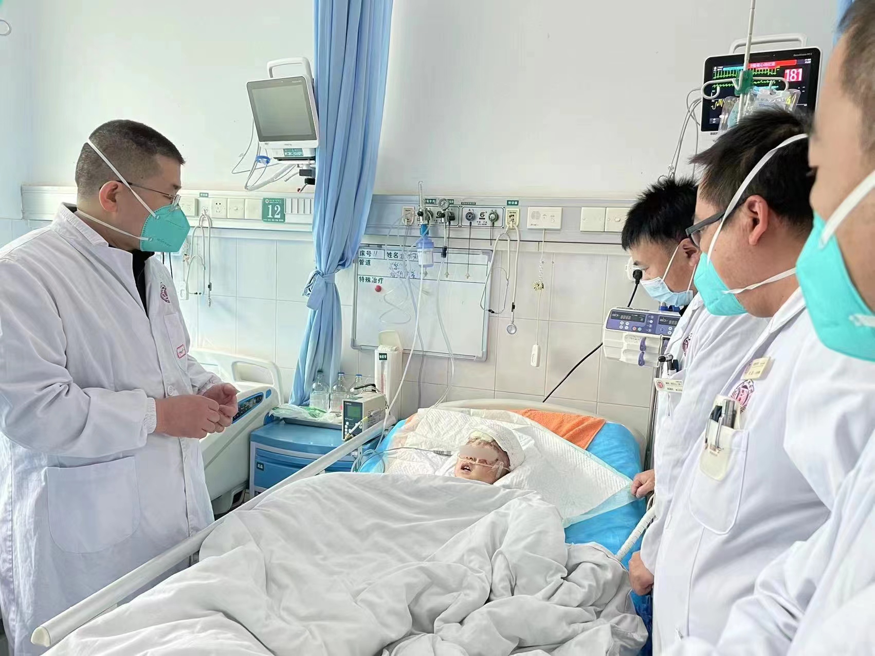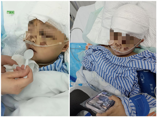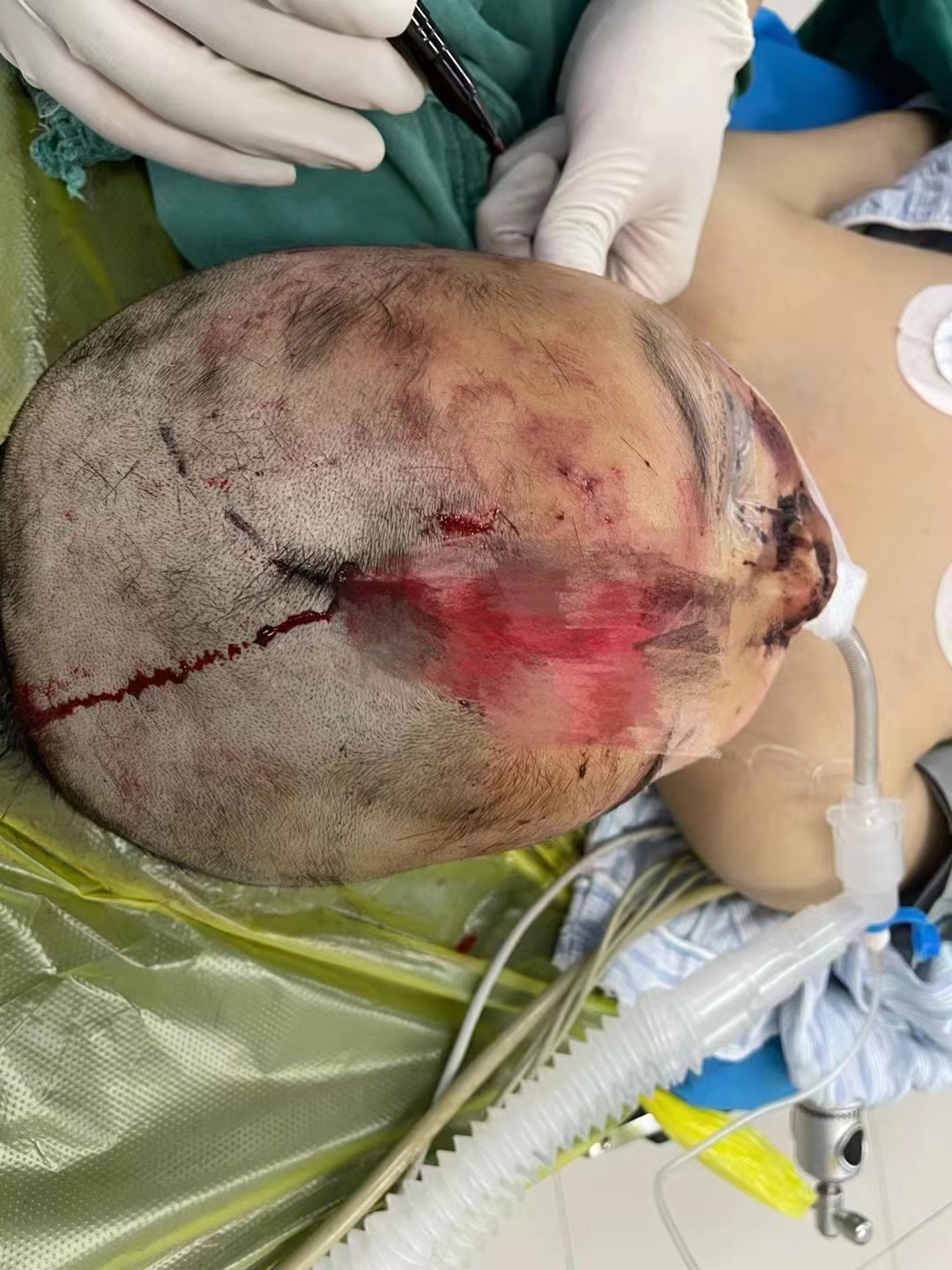 神经外科二病区主任胡林旺、副主任医师薛智接到通知,查看患儿颅脑CT,提示“开放性颅骨骨折、颅骨粉碎性骨折”,此时孩子已经呈现嗜睡状态,需立即手术。胡林旺主任带领团队对各种可能出现的危急情况准备了相应的预案,马上实施急诊手术。由于患儿年纪小,气道发育不完善,全身麻醉后容易出现呕吐、误吸、喉痉挛等风险,麻醉用量也是极其谨慎。