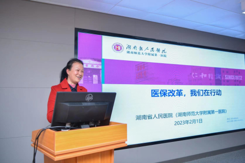 秦月兰副院长向与会人员简单介绍了医院基本情况后,对医院医保改革实践及存在的问题与建议作了详细汇报,包括推进DRG支付制度改革、落实“门诊共济”改革、助力湖南医保事业发展所做的工作,并重点提出了目前医院在“门诊共济”结算与诊疗、门诊慢特病待遇落地以及医保支付方式改革等方面存在的问题及建议。