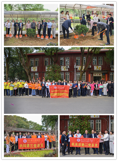 活动开始后,五个党支部依次带来精彩的快闪节目,方阵人员在植树现场唱响《我和我的祖国》,用“绿色快闪”方式寄语绿色生活,通过以总支为单位认领和点缀种植的方式,逐步改善院内环境,让医院环境更美更绿,成为人人喜爱的吾院吾家。植树活动现场,大家分工合作,配合默契,干劲十足。挖坑、放苗、扶苗、对齐,培土,踩实……各个环节衔接有序,现场呈现出一片其乐融融、热火朝天的景象。接连种下的茶树、风车茉莉、凌霄、欧月、红木香等沐浴在温暖的春光里。