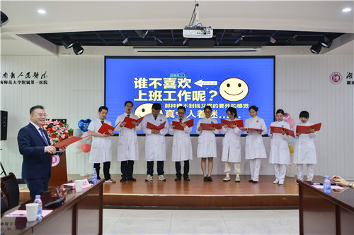 庆典活动在乳甲外科二病区医务人员准备的节目《我爱上班》中拉开序幕,表演风趣幽默,引得哄堂大笑。