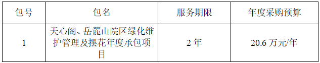 医院根据工作需要,拟在“51医疗采购平台”上采用院内公开招标方式对天心阁、岳麓山院区绿化维护管理及摆花年度承包项目进行招标采购,现公开邀请符合投标资格要求的供应商前来参加。