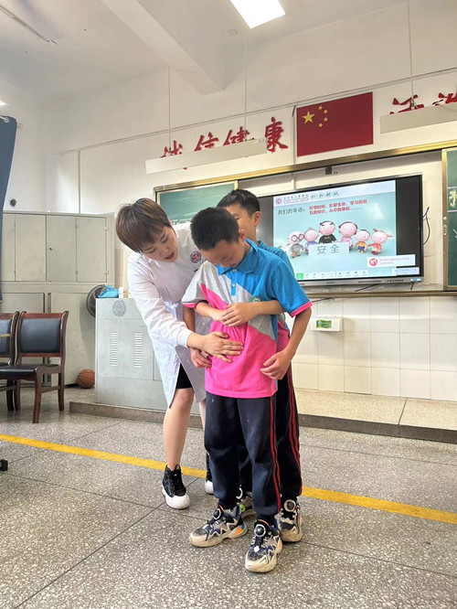 通过简单的PPT结合通俗易懂的语言,为大家讲解了一些急救知识和心肺复苏术,并在现场演示进行教学。神经内科医护工作者利用情景模拟向小朋友们演示如果发生气道异物梗阻时需要立即用海姆立克急救法将气道内异物排出。对在场的同学们进行“手把手”教学,使同学们真正的掌握心肺复苏术操作和海姆立克急救法的流程和要点。