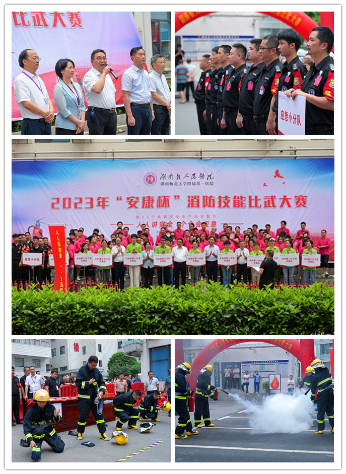 人人讲安全,个个会应急!为进一步提高我院职工的消防安全意识和应对突发情况的处置能力,最大限度地保障住院患者及群众的生命财产安全,6月16日下午,我院保卫部、工会在天心阁院区联合举办了2023年“安康杯”消防技能比武大赛。省卫健委机关后勤服务中心主任、安全生产办公室主任周奇,我院党委书记谭李红,纪委书记、工会主席胡永红,副院长朱文辉,院领导谢爱明出席活动。保卫部、工会全体管理干部以及来自全院11个分工会、保卫部应急小分队的12支参赛队,共160余人参加了开幕式。