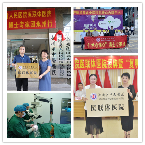 携手共建医联体,优质医疗惠民生。7月19-21日,由社会医学部组织,我院党委委员、总会计师陈晓兰带队“仁术心连心”博士团来到永州市中医医院、祁阳市中医医院,隆重举行了医联体医院授牌仪式暨博士团活动。“复明10号”中国流动眼科手术车项目第119站祁阳站活动也于当天正式启动。