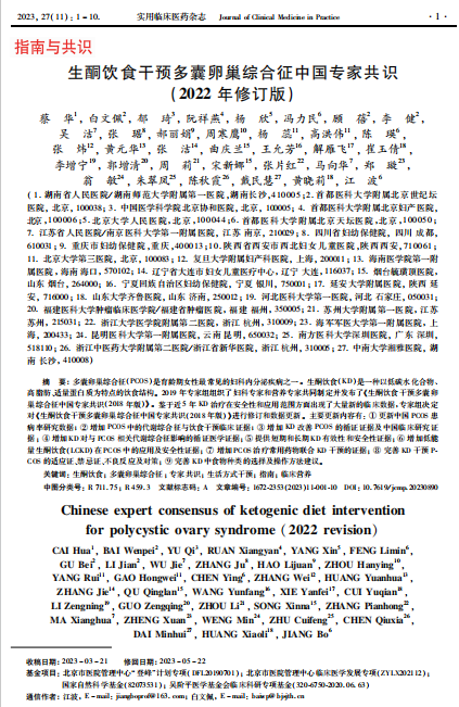 近日,由湖南省人民医院(湖南师范大学附属第一医院)、首都医科大学附属北京天坛医院等27家医院共同修订的生酮饮食干预多囊卵巢综合征中国专家共识(2022年修订版)发表在《实用临床医药杂志》上。