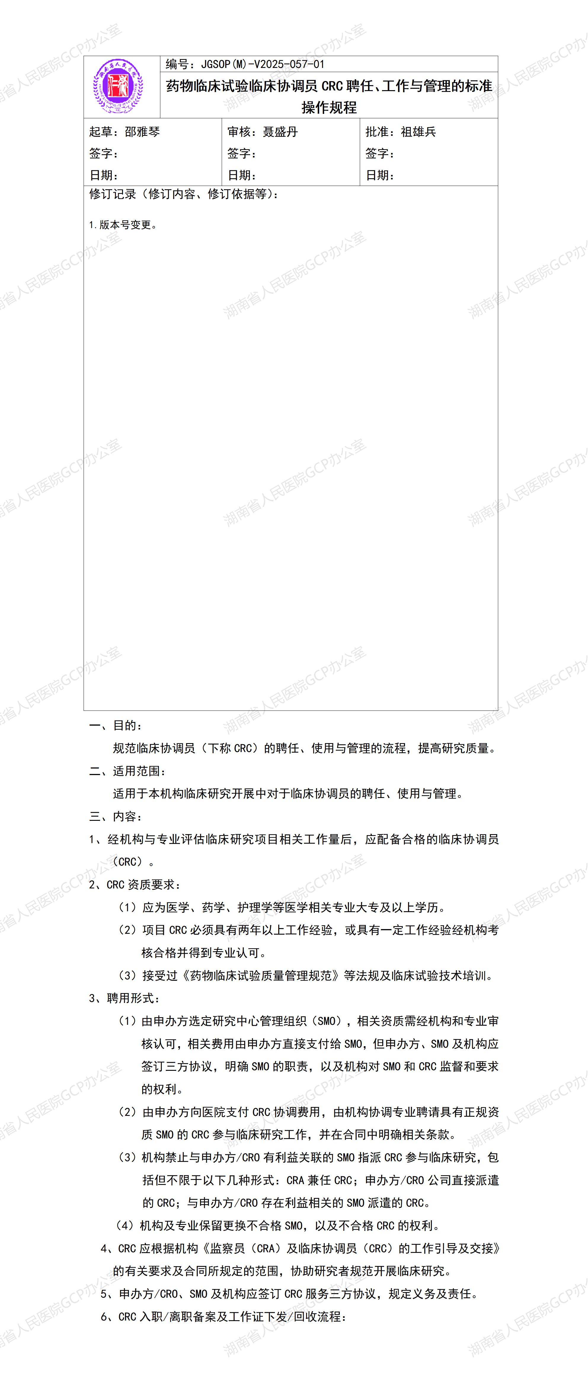 临床试验临床协调员CRC聘任、工作与管理的标准操作规程