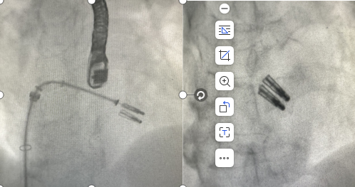 术前,科室组织多学科会诊,由心脏大血管外科、心内科、麻醉科等多位专家共同讨论并一致认为,老人二尖瓣病变严重,同时合并有冠心病、心律失常、心功能不全等多种高危因素,已不适用外科手术,在微创下不开胸实施二尖瓣钳夹术是最佳选择。经手术团队充分缜密的术前准备,在超声引导下器械经股静脉穿刺房间隔,将MitraClip系统送入患者左心房,到达二尖瓣反流处,在经食道超声及DSA引导下,术者通过评估二尖瓣反流位置、抓捕位置、反流程度,精准夹合,成功植入2个二尖瓣夹。二尖瓣从术前的大量反流减轻到微量反流,肺静脉的逆流完全消失,血压从偏低恢复到正常状态,第二天即下床,术后第5天顺利出院。