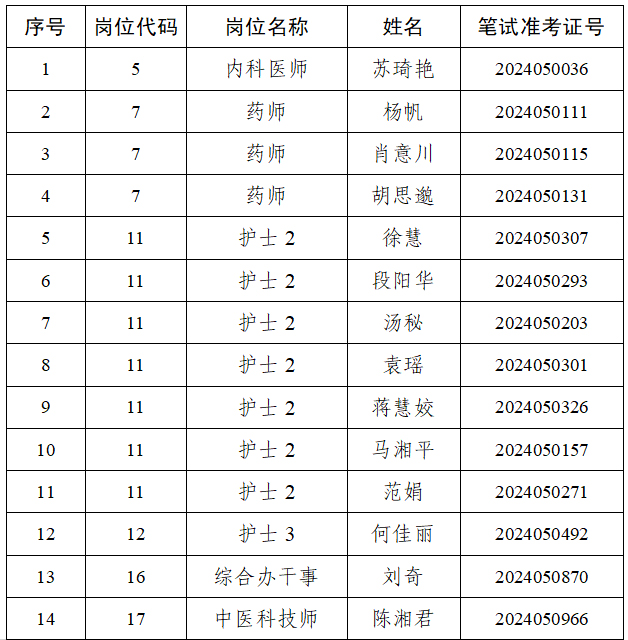 根据《湖南省人民医院蓉园院区(省委机关医院)2024年公开招聘公告》要求,我院现场资格复审工作已完成,现有部分岗位共19名入围资格复审的考生放弃入围资格,现对相关岗位按笔试成绩排名进行递补,递补名单如下: