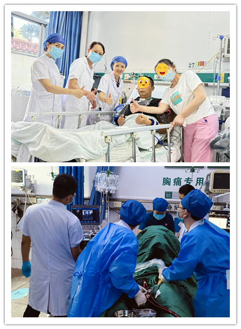 39岁的李先生是一名建筑工人。两天前,正在工作中的李先生突然倒地、心跳和呼吸均消失,被工友呼叫120送至湖南省人民医院马王堆院区急诊二部进行抢救。在进行心肺复苏术,气管插管,呼吸机辅助呼吸等救治措施后,患者仍无法恢复自主循环,于是在家属同意后,急诊ECMO团队等医护人员迅速为患者安装好这一终极救命神器。通过ECMO的帮助下,患者终于恢复心率。与此同时,急诊科、介入科、心内科等多学科迅速联合治疗,明确并解除病因,打通患者心脏上被堵死的冠脉,继续进一步治疗。