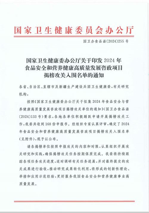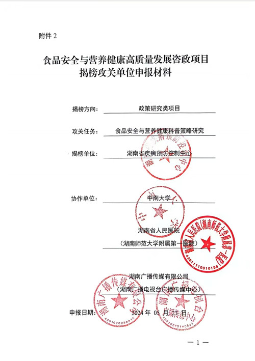 近日,国卫办食品函[2024]255号文件发布了揭榜攻关课题的入围单位,2024年5月底湖南省人民医院临床营养科与湖南省疾控中心、中南大学、湖南广播电视台联合申报的国家卫健委2024年食品安全和营养健康高质量发展咨政项目-食品安全与营养健康科普策略制定及效果评估研究顺利入围。