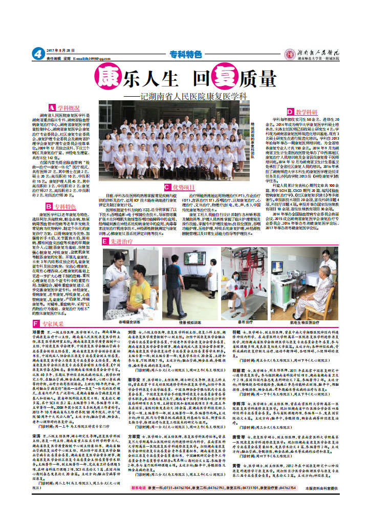 湖南省人民医院康复医学科是湖南省重点临床专科,湖南省脑血管病康复治疗中心、湖南省康复医学质量控制中心、湖南省康复医学会康复治疗专业委员会、社区康复专业委员会、康复护理专业委员会及湖南省护理学会康复护理专业委员会挂靠单位。2009年12月独立成科,下设三个病区及康复治疗室、神经电生理室,共有床位142张。
