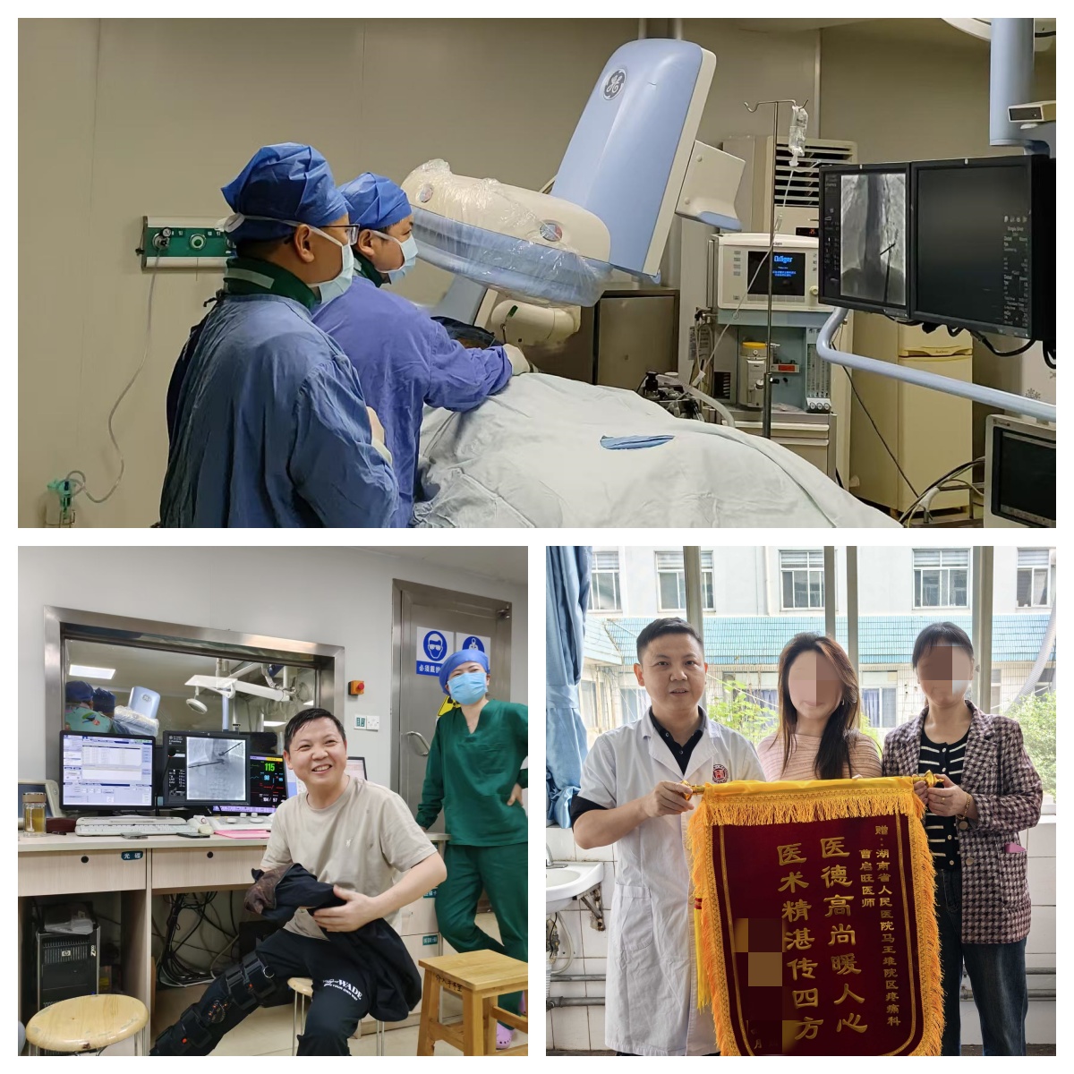 手术前,曹启旺主任因意外致髌骨骨折,接受了急诊手术,医生建议他休养,但考虑到李爷爷从外地专程赶来,饱受疼痛煎熬,曹主任决定如期手术,他忍着疼痛,坐着轮椅进入介入手术室,在团队配合下,通过球囊扩张巧妙恢复椎体高度,并精准注入骨水泥稳定骨折,手术一气呵成。术后6小时,李爷爷疼痛明显缓解,并在医护人员指导下顺利下床活动,三天后,李爷爷可以顺利进行日常活动了。出院当日,李爷爷家属亲手将锦旗送到曹主任手中,表达感激之情。