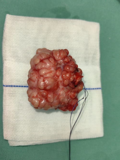 经过反复研讨,周建波主任医师团队决定采用经口入路微创手术方式,手术在鼻内镜高清视野下进行,术中医生小心分离缠绕的血管神经,用等离子刀头沿包膜逐步剥离,每一步都精准到毫米。最终,在团队的密切配合下,肿瘤被完整分离,术后病检为纤维性肿瘤。