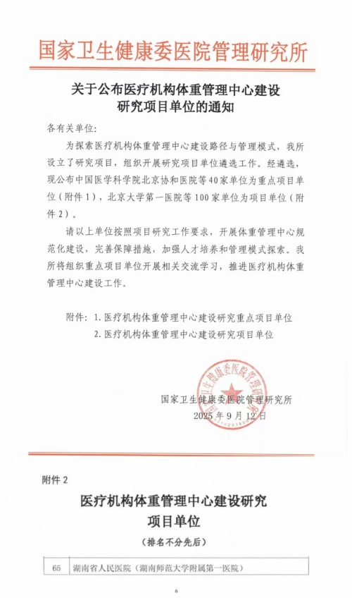 9月13日,国家卫健委医管所公布了医疗机构体重管理中心建设研究项目立项名单,我院临床营养科申报课题再度获批。本次体重管理中心建设实行院长负责制,联合17个科室、覆盖三个院区,全院协同、全力推进,严格按建设标准推动项目落地实施。从医院层面到政府项目支持,再到基层体重管理门诊建设与专业人才培养,各项工作稳步推进。自湖南省卫健委工会依托我院发起“健康体重、医者先行”活动以来,该项目已在全省范围内广泛推广,我院正逐步成为区域体重管理工作的引领者和推动者。