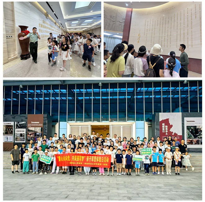 在抗战胜利80周年之际,9月14日上午,湖南省人民医院联合湖南省少年儿童图书馆、国防科技大学,共同开展“家院共建促成长”系列活动之“童心永向党,共筑强军梦”亲子军营体验日活动。50组职工家庭走进国防科技大学三号院。在官兵引导下,家长与孩子们依次参观校史馆、宿舍区、训练场等区域,聆听学校光荣历史与现代化强军的成就。活动通过沉浸式军营体验,引导省医青少年树立爱党、爱国、爱军信念,厚植家国情怀。