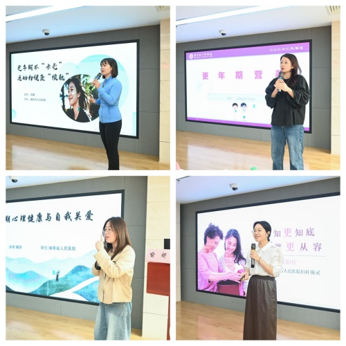 四位深耕女性健康领域的专家轮番登场,用专业与温度搭建起知识传递的桥梁。妇科主任黄薇以《更年期不“卡壳”,运动为健康“续航”》为主题,结合自身体会拆解更年期运动保健的关键要点,让“科学运动”成为女职工应对身体变化的实用工具;临床营养科主任营养师蔡华围绕《更年期女性的营养管理》,从膳食搭配、营养补充等维度,给出适配职场女性生活节奏的饮食方案;临床心理科副主任医师喻妍则以《更年期心理健康与自我关爱》为切入点,引导女职工正视情绪变化,传授自我疏导与心理调适技巧;妇科副主任医师陈灵的《知“更” 知底,过渡 “更” 从容》,更是用通俗的语言解读更年期生理变化,帮在场女职工打破认知误区,建立科学应对心态。